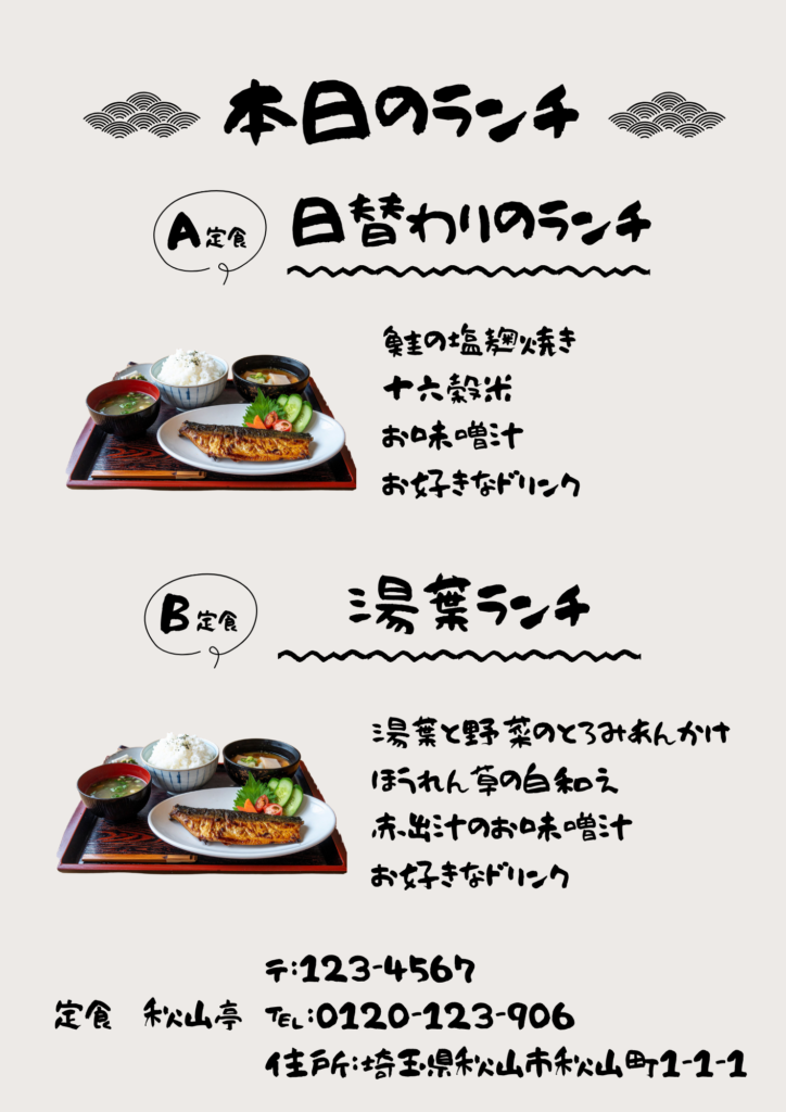 7デザインのポイント手書き風の筆文字フォントを使用することで、和食店らしい温かみと親しみやすさを表現した点が最大のポイントである。また、A定食とB定食を上下で分けることで、メニュー内容が直感的に理解できる構成にしている。さらに料理写真を目立つ位置に配置し、視覚的に食欲を刺激するよう工夫した。余白を活かしたシンプルなデザインも特徴である。