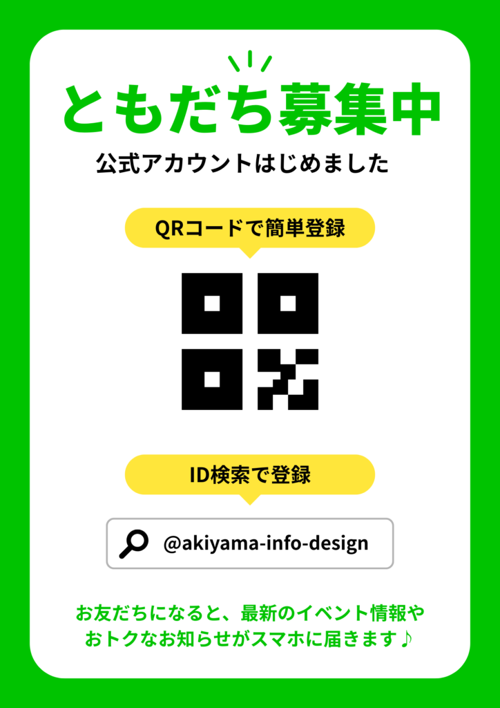 7デザインのポイントデザインでは、ユーザーが登録方法を一目で理解できる構成を重視した。QRコードを中央に大きく配置することで視線を集め、登録のアクションを促すレイアウトにしている。また、緑色を基調とした配色を使用することでLINEのイメージカラーと統一し、SNS案内として分かりやすいデザインにした。シンプルな構成にすることで視認性を高めている。