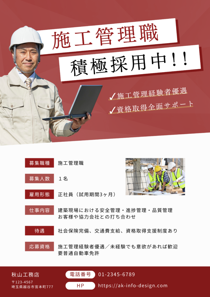 7デザインのポイント赤を基調としたカラーリングを使用することで、採用広告としてのインパクトと視認性を高めた点がポイントである。また、「施工管理職」「積極採用中」といった重要なメッセージを大きく配置し、視線を自然に誘導する構成にしている。人物写真を配置することで仕事内容のイメージを具体化し、信頼感のあるデザインに仕上げた。