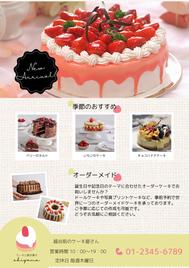 2作品タイトル「越谷駅前のケーキ屋さん」新商品紹介チラシデザイン