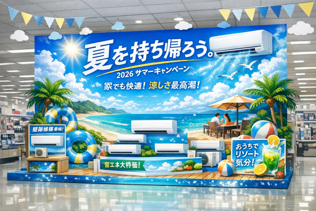 1作品ジャンル店頭販促用キービジュアル兼売り場演出ポンチ絵。家電量販店の季節キャンペーンに合わせた大型パネルと什器装飾を想定した空間提案型ビジュアル。