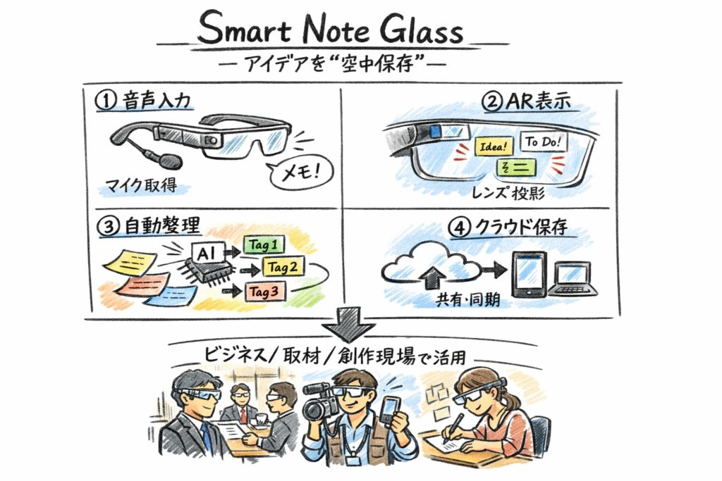 2作品タイトルSmart Note Glass ― 発想を逃さない知的拡張デバイス構想。思考・記録・共有を一体化し、創造性を加速させる未来型プロダクト。